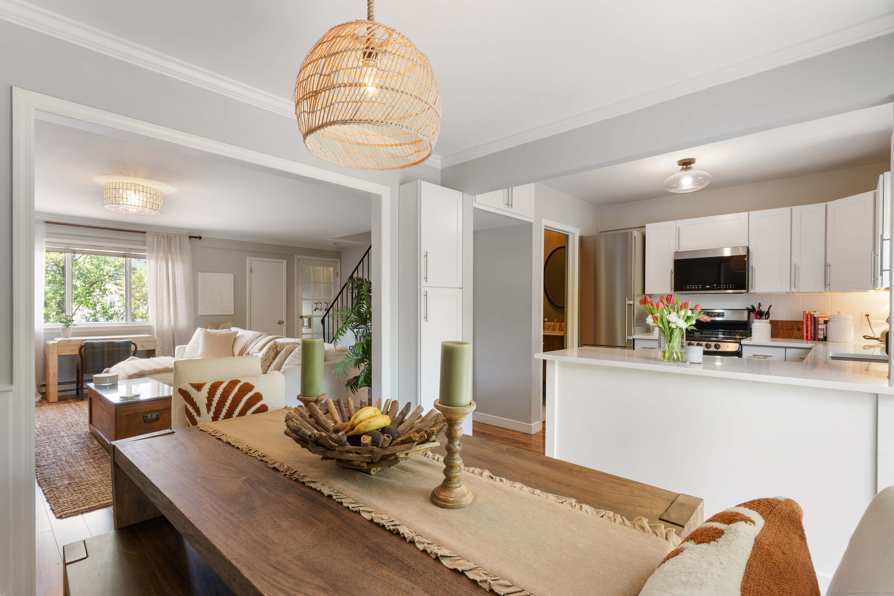Rare opportunity to own one of a few condominiums in the desirable Harbor Point neighborhood! Light and spacious home within a 5-minute walk to the lively waterfront area shops, dining, and nightlife. Just a 10-minute walk from Stamford Station with Metro North & Acela trains to Manhattan/NYC (45 mins). The inviting 1,135 square-foot interior has a wonderful flow for entertaining friends and family. A foyer opens to the large living room (18' x 17') for catching up and relaxing at the end of the day. The formal dining room adjoins an eat-in kitchen with stainless steel appliances, along with a newly renovated guest bath and lovely deck overlooking the backyard. Upstairs you'll find two generous bedrooms and a full bathroom, making a perfect primary suite and a second guest bedroom/office capturing views of Harbor Point. Rounding out the second floor is a convenient laundry closet. Be the first to see this beautifully maintained and decorated condo unit featuring hardwood floors, raised-panel wainscoting, built-ins, custom staircase with iron balustrade and ample windows filled with abundant natural light and views from every room. Highest and best due by Monday the 2nd at Noon.